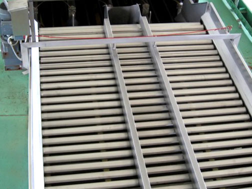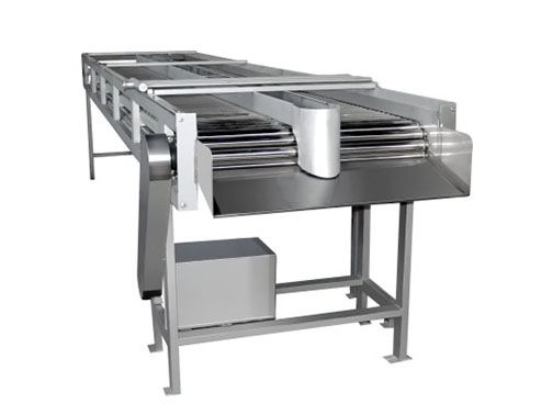 不銹鋼鏈條帶動滾杠移動,滾杠在橡膠軌道上因磨擦而自轉,從而帶動果蔬自由旋轉,配合人工檢選,挑去不合格果蔬。